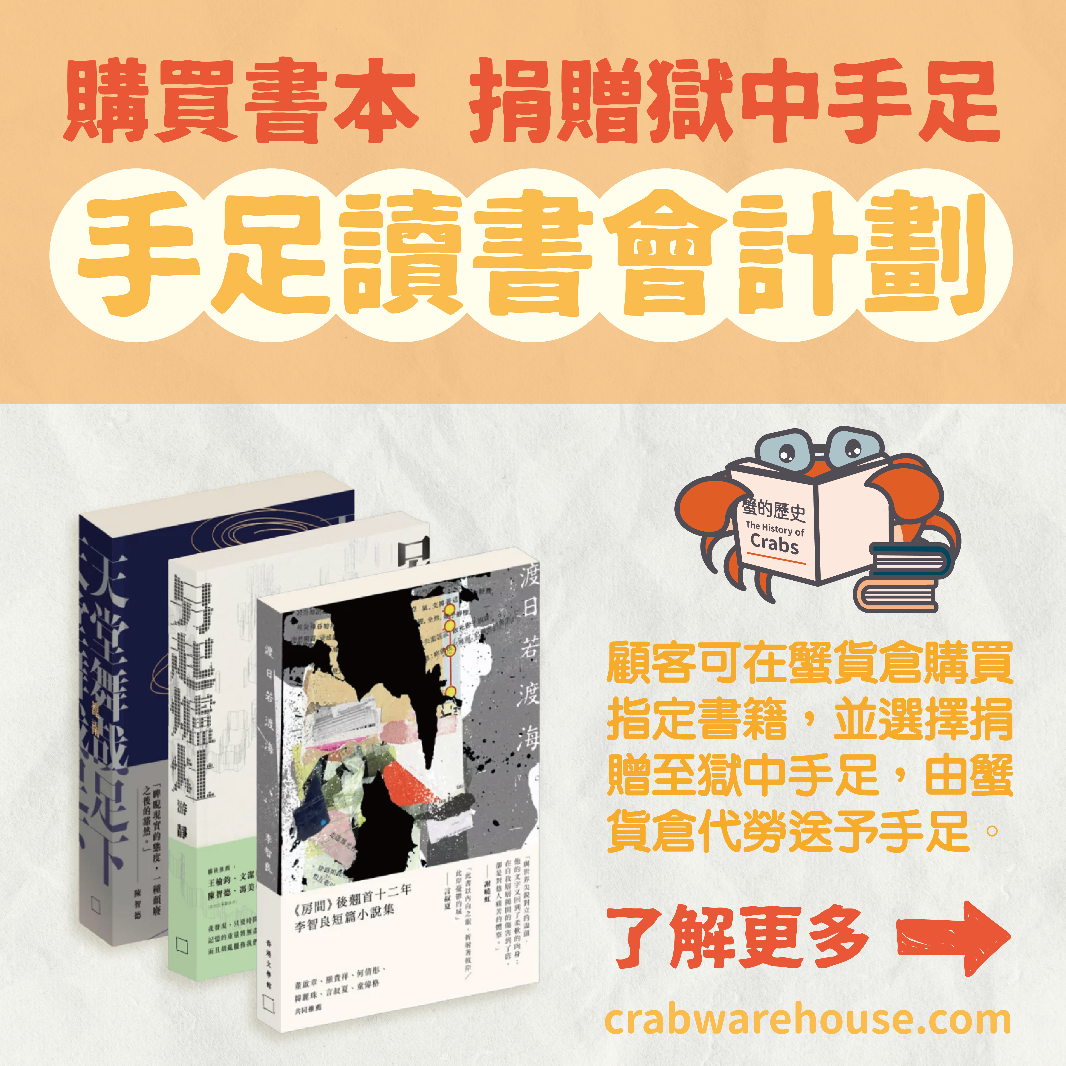 蟹貨倉會作為一個平台,把書籍進行篩選,上架後,供各位選擇購買,並代為捐出,並確保書籍可以順利送到在囚手足手上。